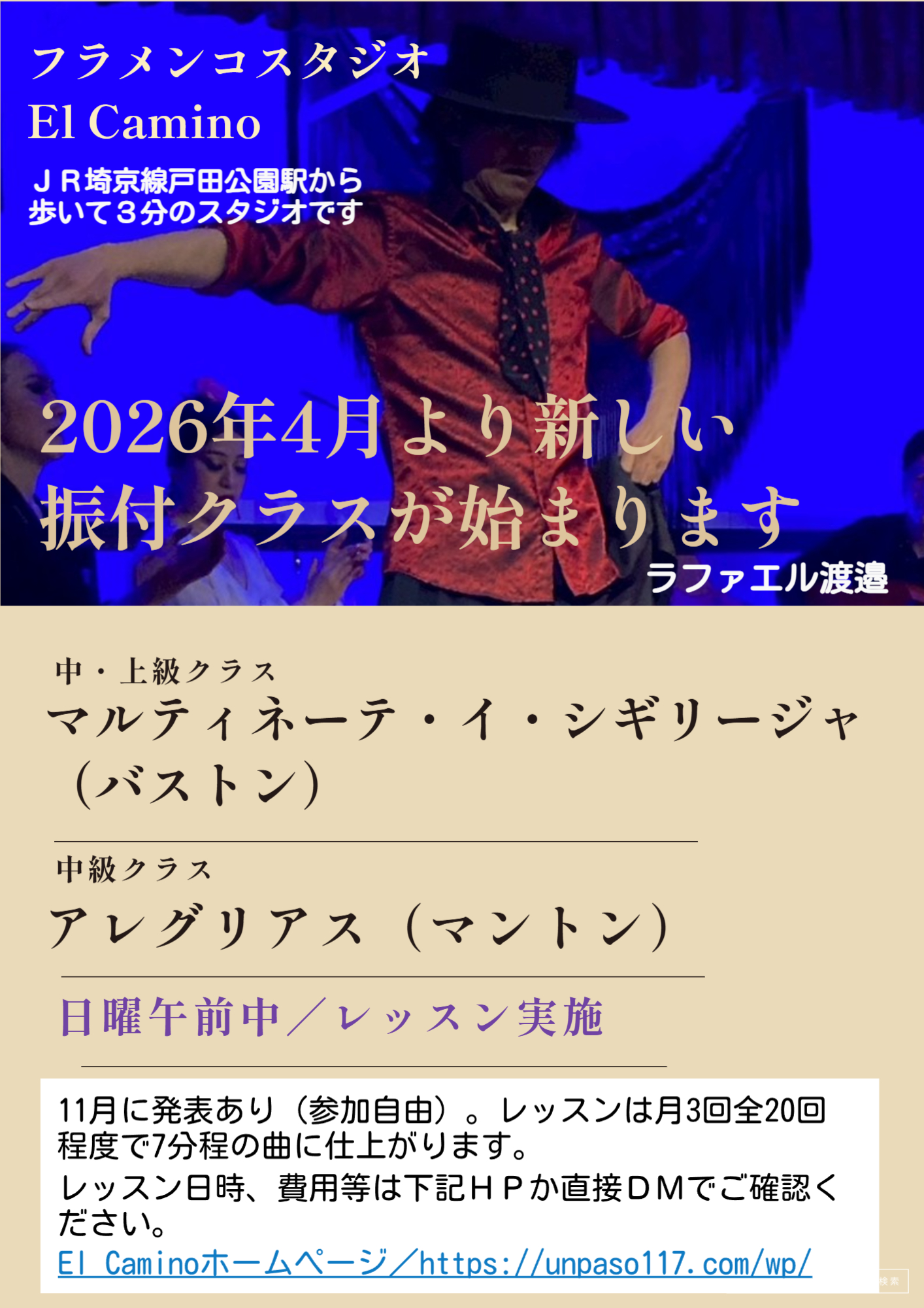 初級クラスはファンダンゴ・デ・ウェルバをやっています(アバニコ使用)。こちらは1番が終わったところです。